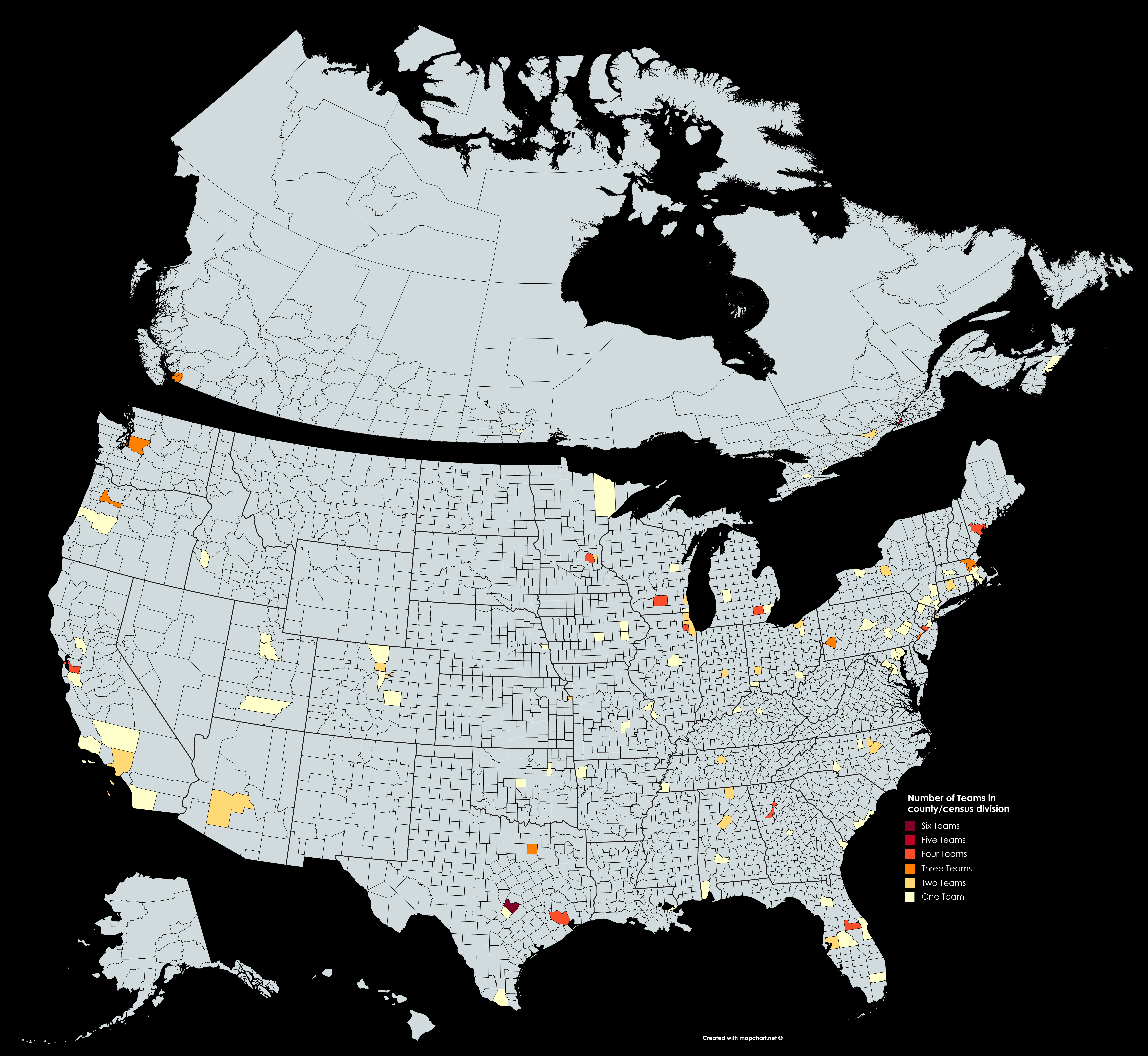 Map Info & Chart : Ultimate Frisbee Teams in the US and Canada (Club Men’s)