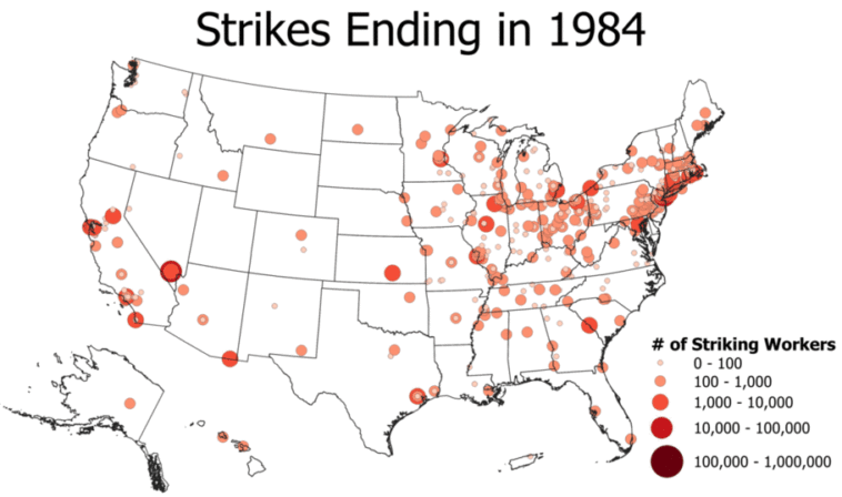 US Strikes Mapped, 1984-2017, categorized by # of Workers Striking (all locations approximate)