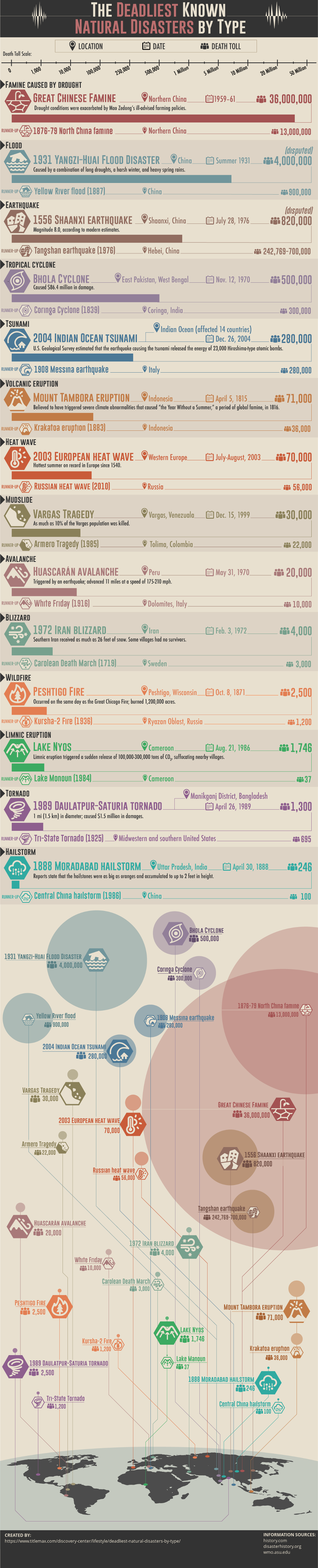 Map Info & Chart : Where the deadliest natural disaster of each type occurred and how many lives were lost (901 × 4448