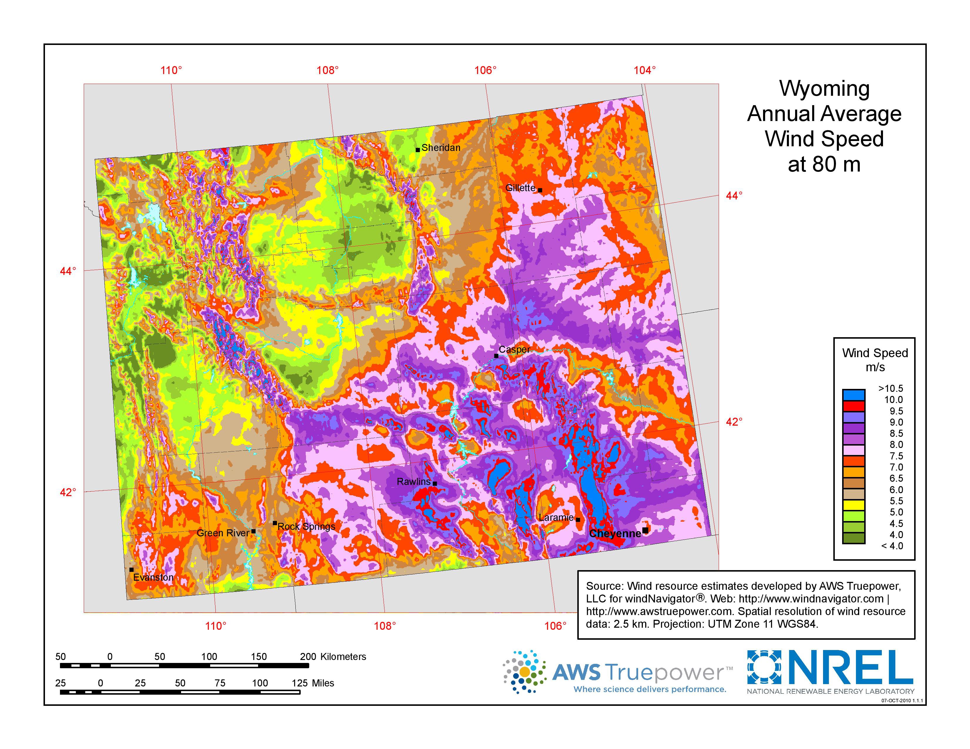 Map Info & Chart : Wyoming average annual wind speed at 80m