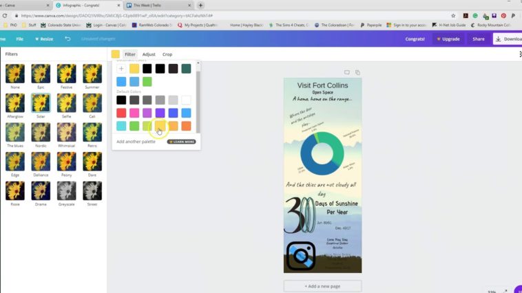 In this write along, I use the www.canva.com platform to create a quick infographic about the outdoor space in Fort Collins. This project took 45 minutes… and of course, it isn’t perfect: we never stop editing, we simply run out of time.