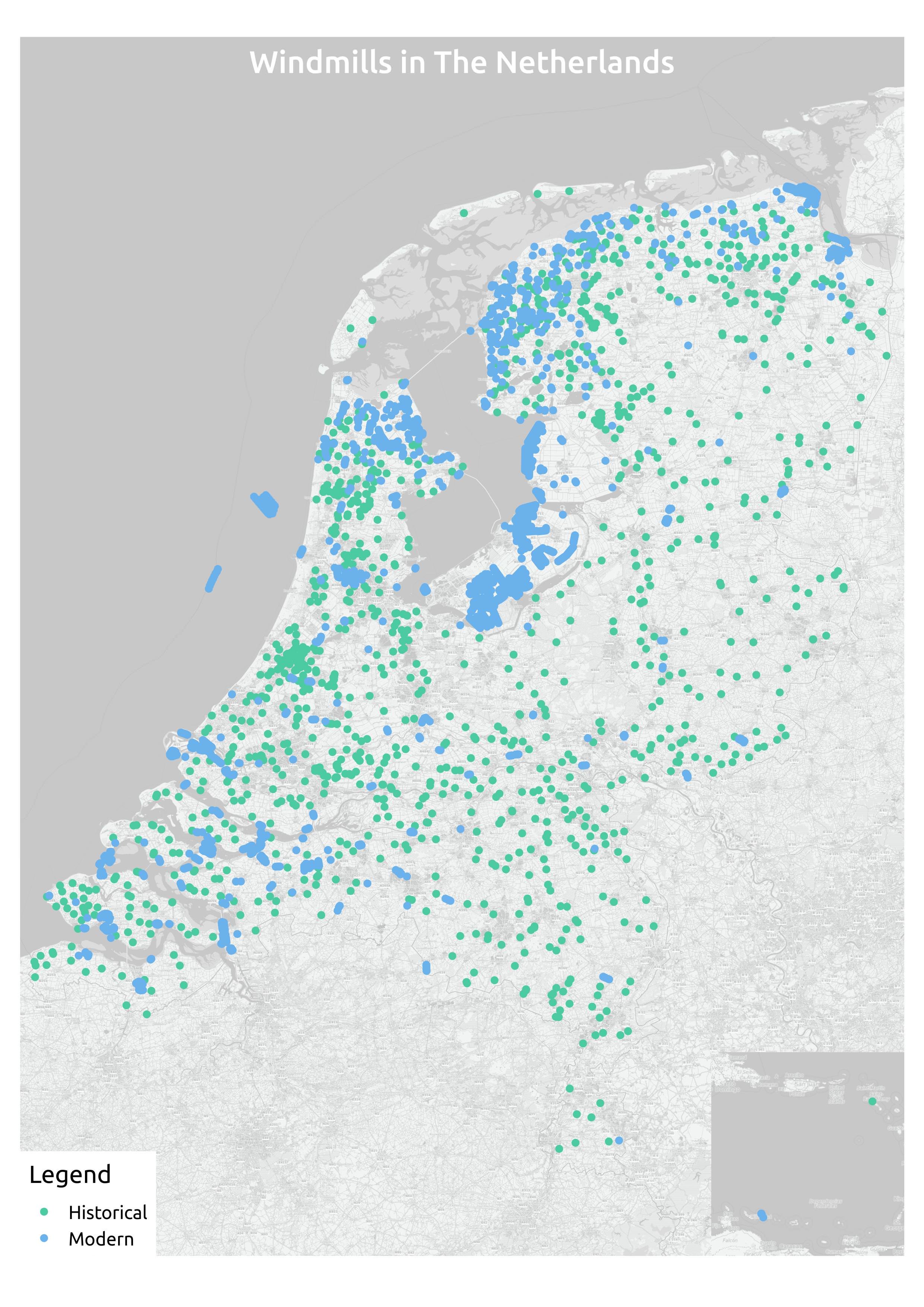 A map with all the windmills in the Netherlands! Modern for energy and historical for tourists. I did not make this