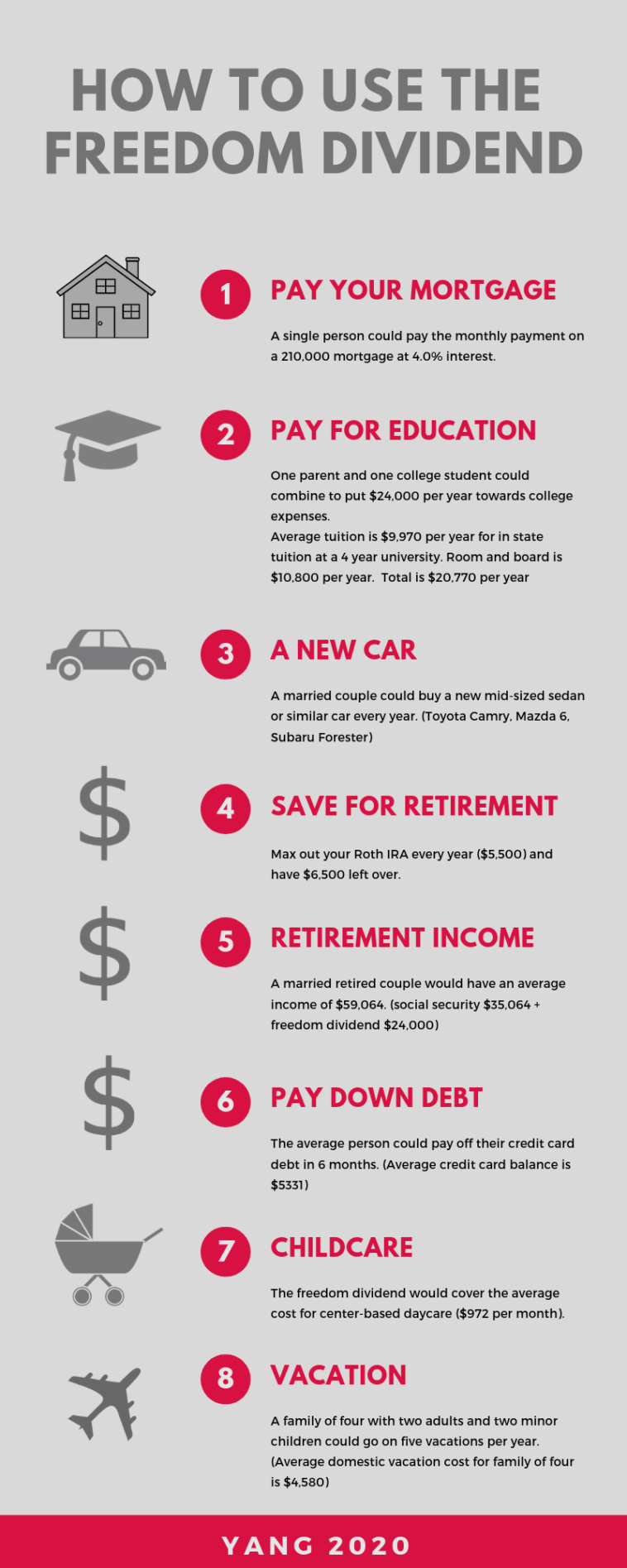 How to use the Freedom Dividend: an infographic illustrating the many possible effects of a UBI to an average American citizen!