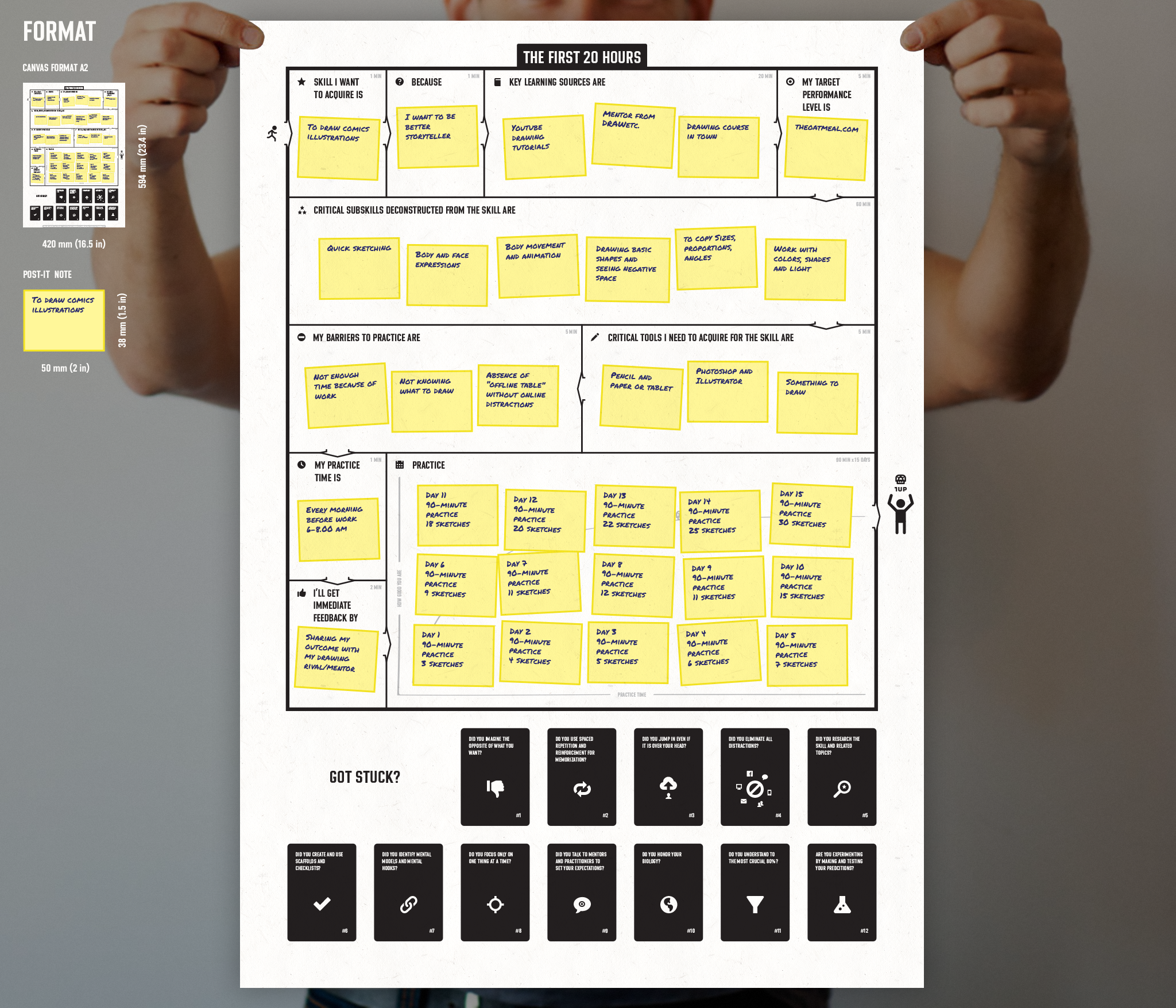 Not sure if this is the right place for it, but I made a poster (for sticky notes) for myself based on the book ‘The First 20 Hours’ to help me start learning new things systematically. [OC]
