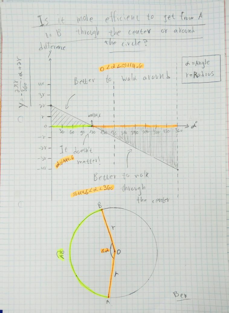 Infographic : [OC] The efficiency of getting from point A to point B on a circle, through the center V.S around the circle, for a given angle: