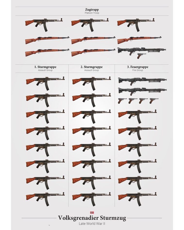 Infographic : Organization of a fully-equipped Sturmzug(Storm platoon) Within the grenadier company of a Volksgrenadier battalion. [1080×1350]