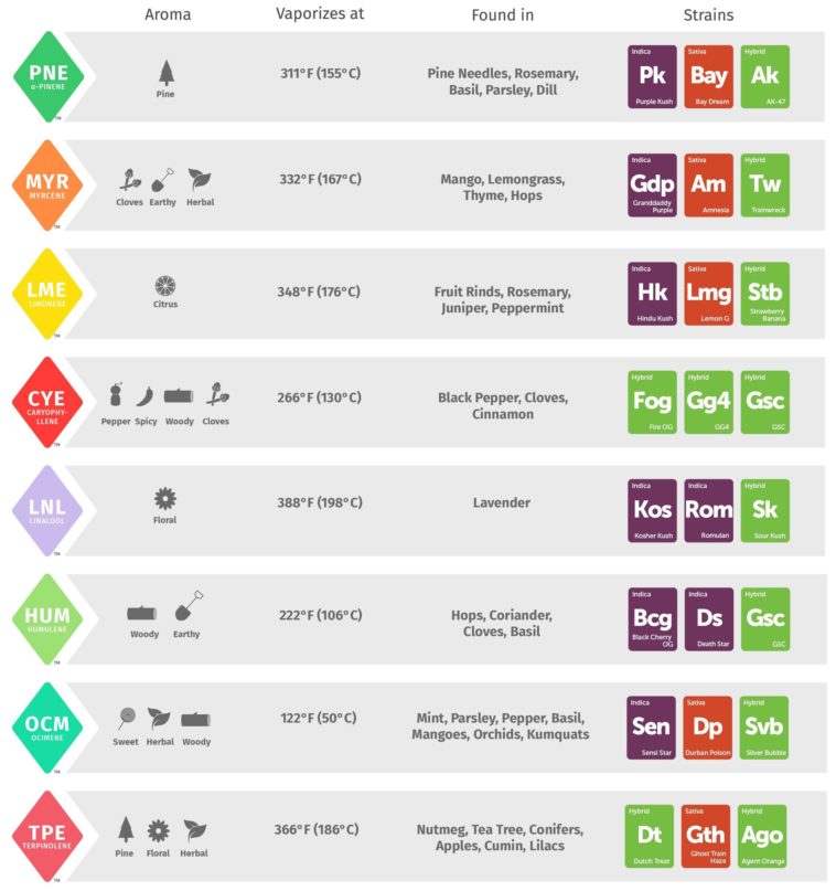 Infographic : Overview of common terpenes found in cannabis and their correlating strains