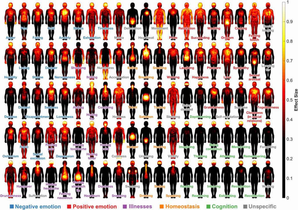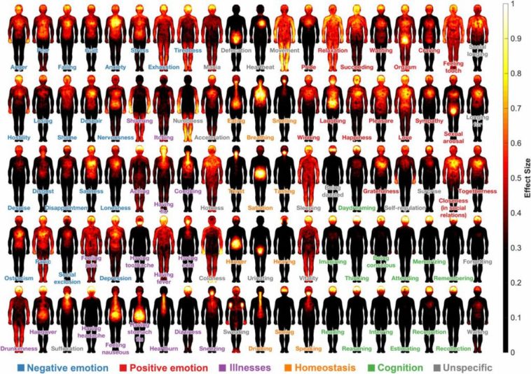 Scientists have produced detailed maps of what they call the `human feeling space’, showing how each of dozens of these subjective feelings is associated with a unique set of bodily sensations.
