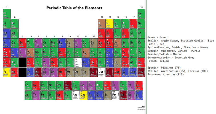 Infographic : The national/linguistic word origins of the elements in the periodic table.