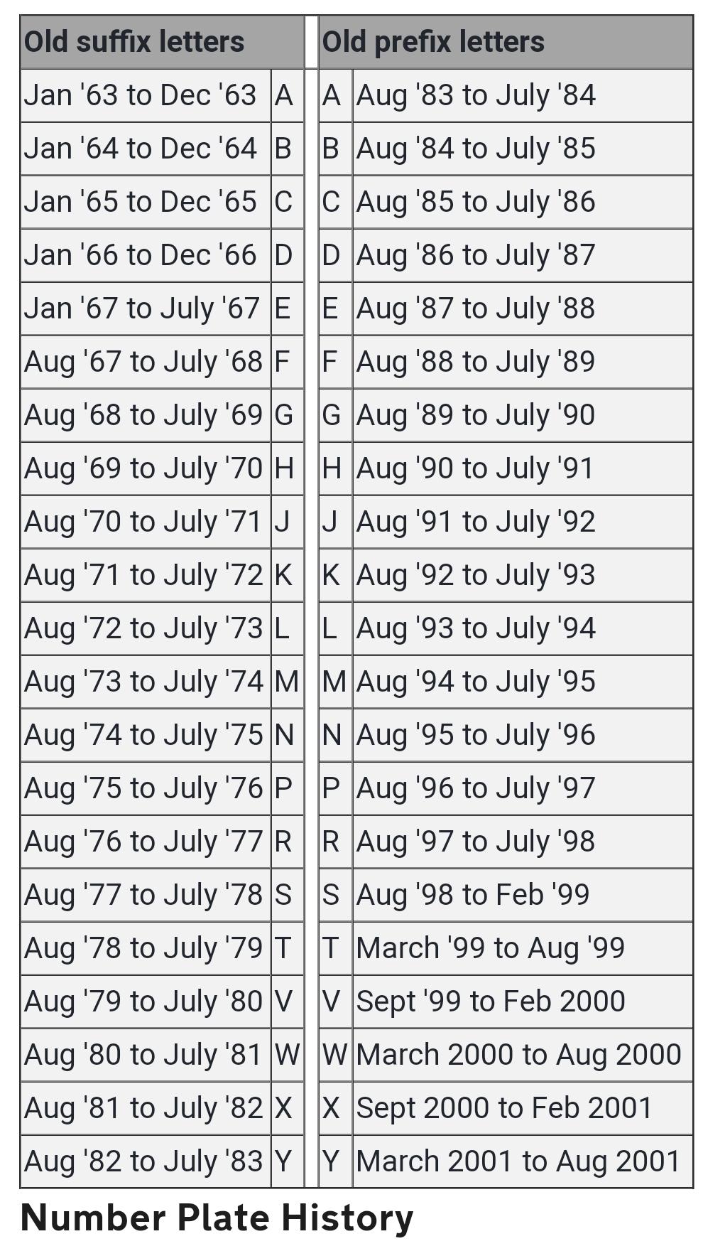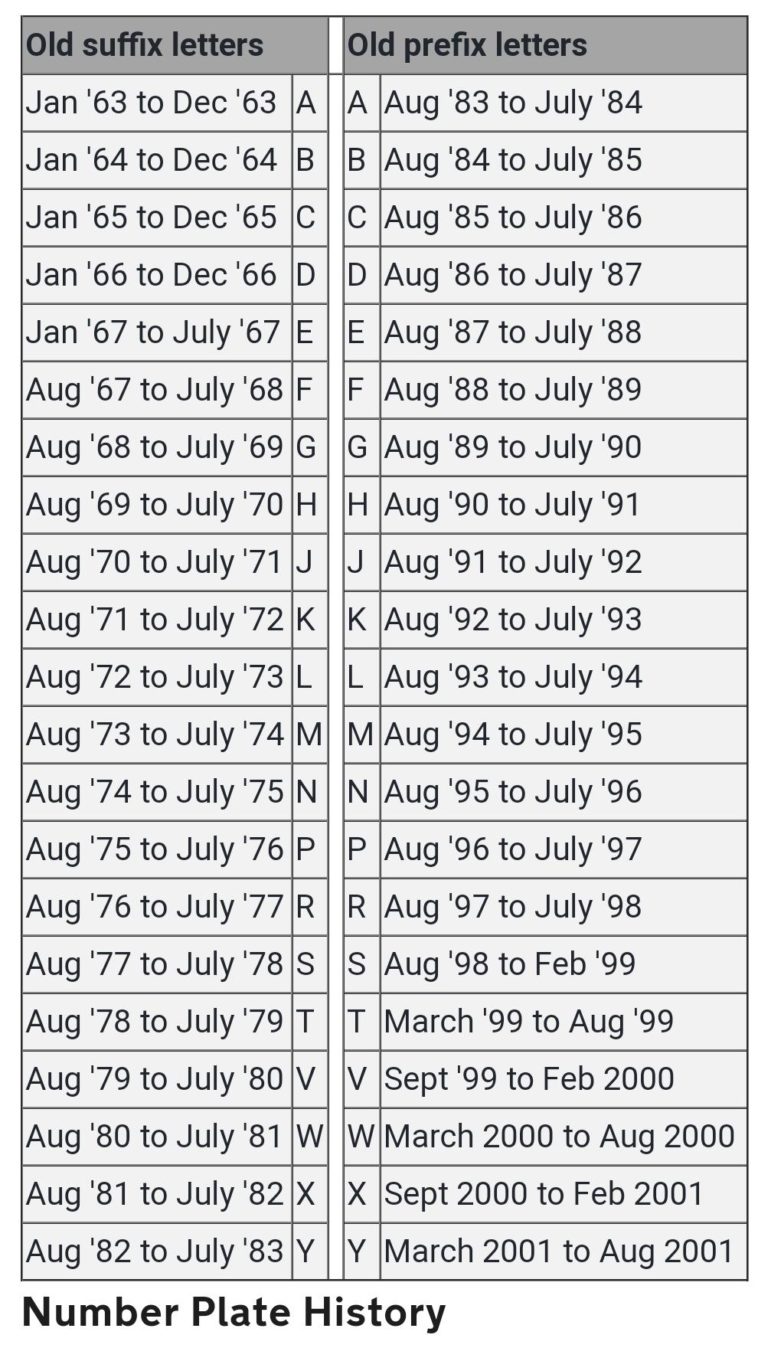 UK number plate formation before 2002. Suffix – letter at the end of number plate. Prefix – letter at the start of the number plate.