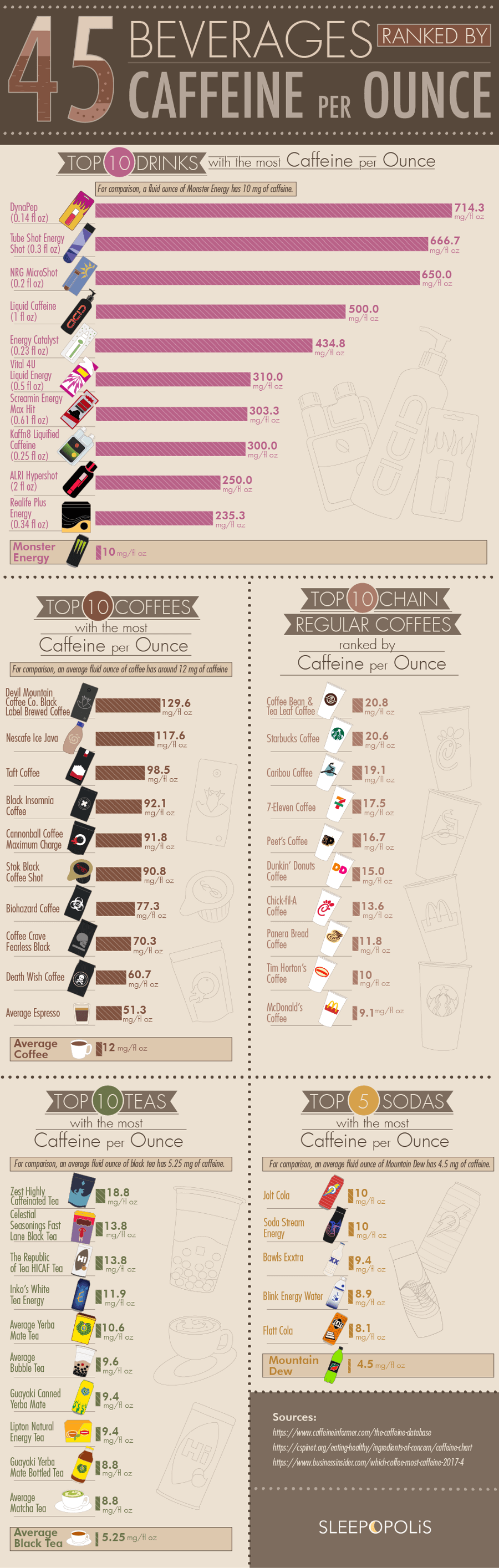 Infographic : Which beverages have the most caffeine per ounce? (includes energy drinks, coffee, tea, soda, etc.)